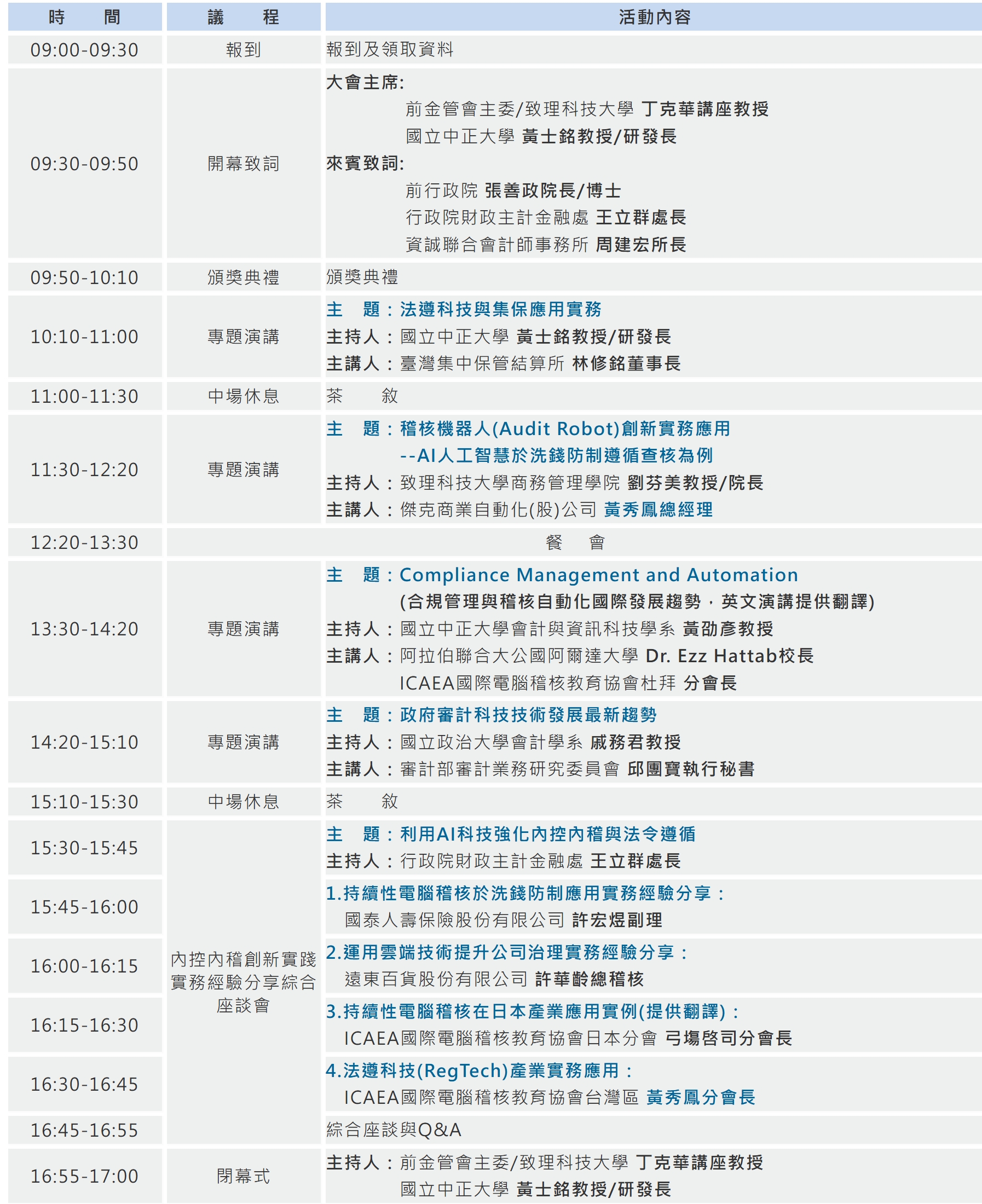 有鑑於國際法遵科技的快速發展及國內推動新南向政策對企業的內控法遵的衝擊,本年度特別與國立中正大學臺灣印度人工智慧科技創新研究中心、致理科技大學金融科技創新實務雲端實作場域計畫辦公室、資策會智慧系統研究所、資誠會計師事務所與中華民國傑出企業管理人協會攜手合作,期望透過產官學研與實務專家的經驗分享,探討國際 AI 稽核科技新趨勢與法遵機器人的應用,透過產官學研的交流座談學習及分享目前國內優質組織如何利用AI與大數據科技,加強內部控制、法令遵循與風險管理之實務作法,讓我們人才培育跟國際接軌,具有新的視野與新機運。